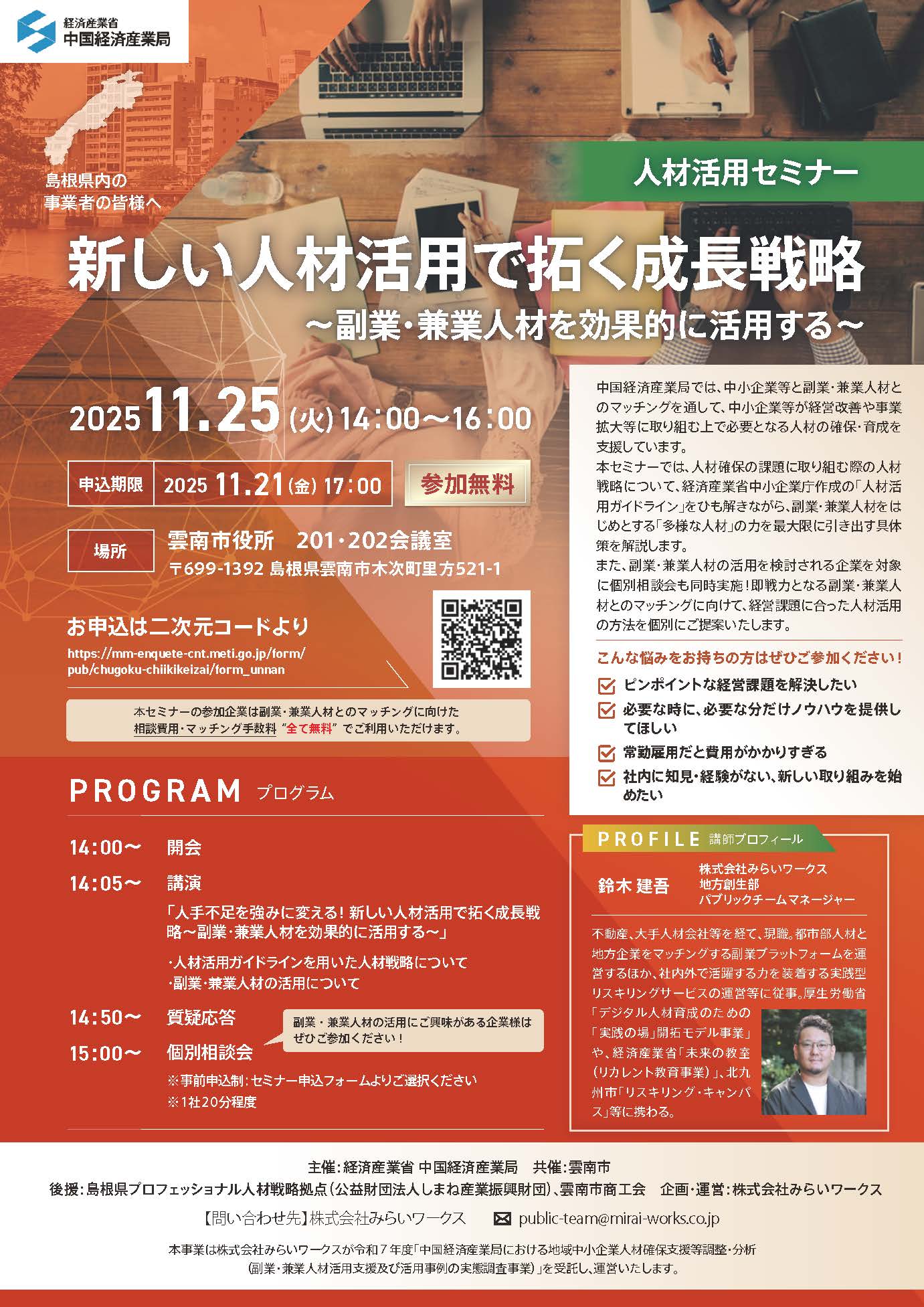 11/25雲南市でセミナー【人材不足を強みに変える!新しい人材活用で拓く成長戦略】が開催されます